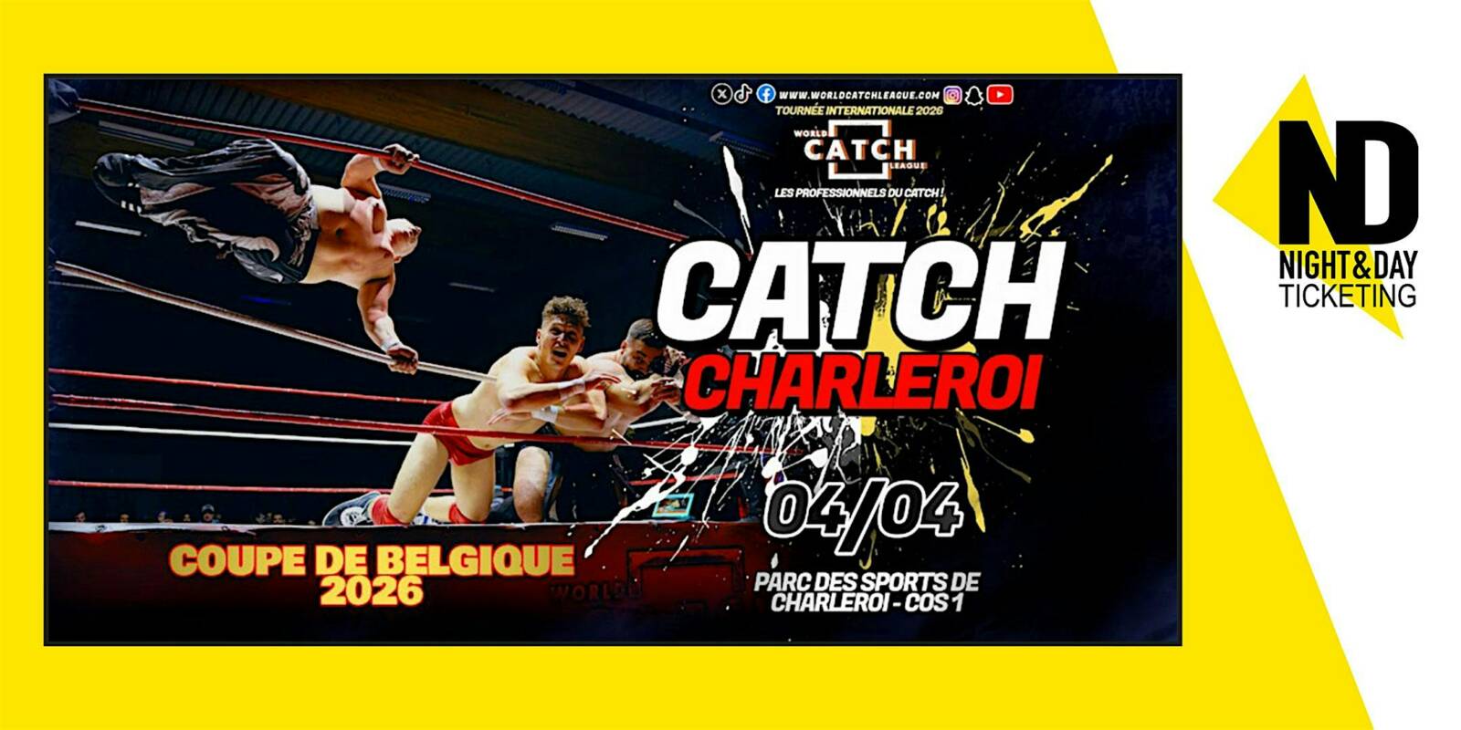 Les catcheurs professionnels de La World Catch League poseront leurs valises, pour la troisième année consécutive, à CHARLEROI, le 04/04 au PARC DES SPORTS DE CHARLEROI – COS 1 pour deux heures de spectacle sportif qui feront vibrer petits et grands.